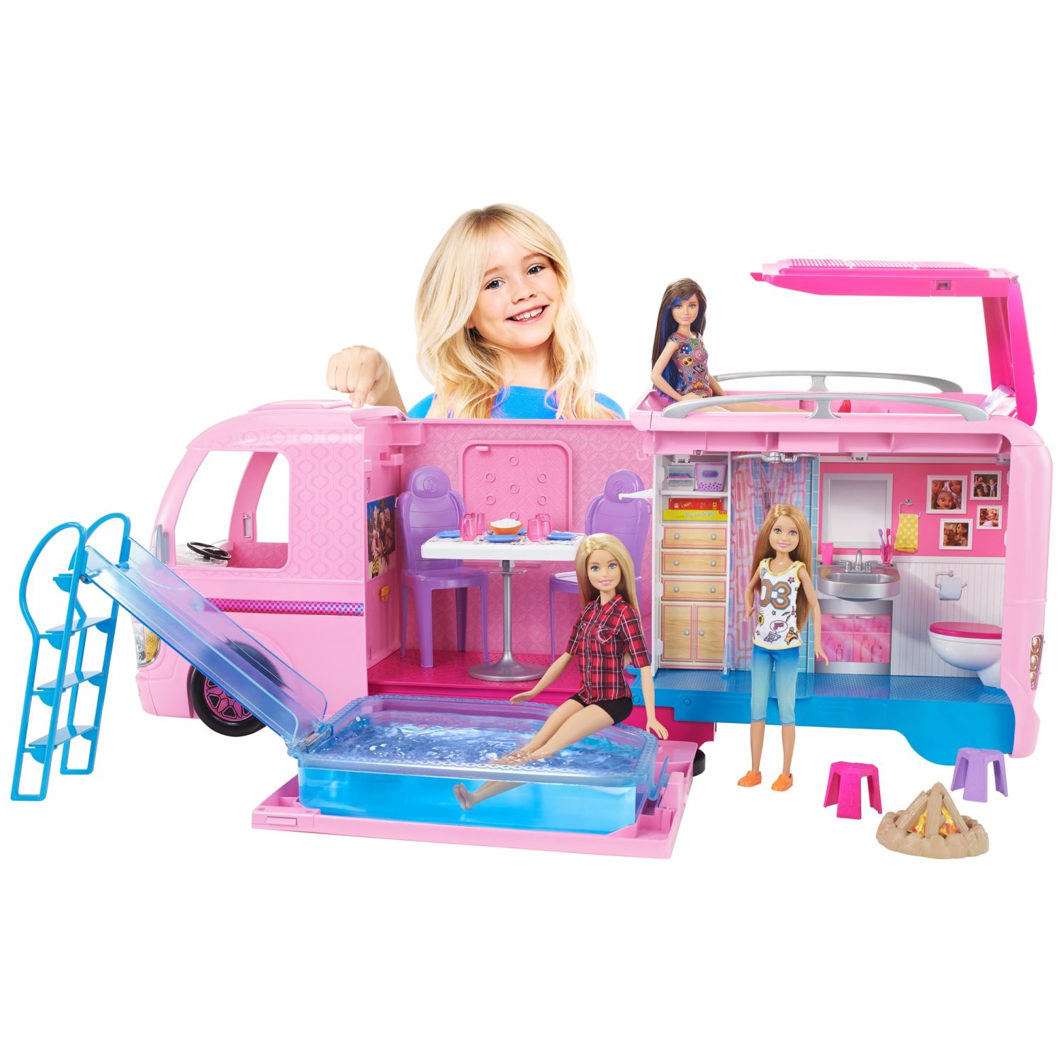 Bu muhteşem karavan, bir karavandan Barbie® ve kız kardeşlerinin içinde uyuyabileceği (bebekler ayrı olarak satılır) kamp alanı oyun setine dönüşür!