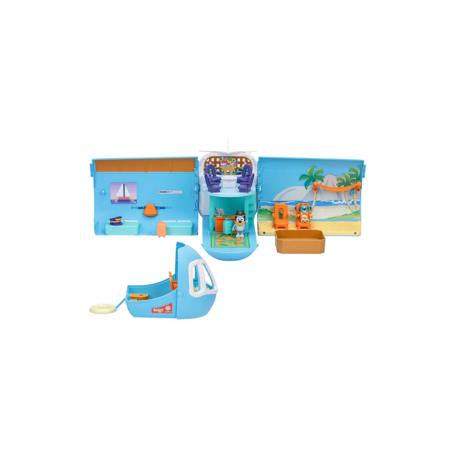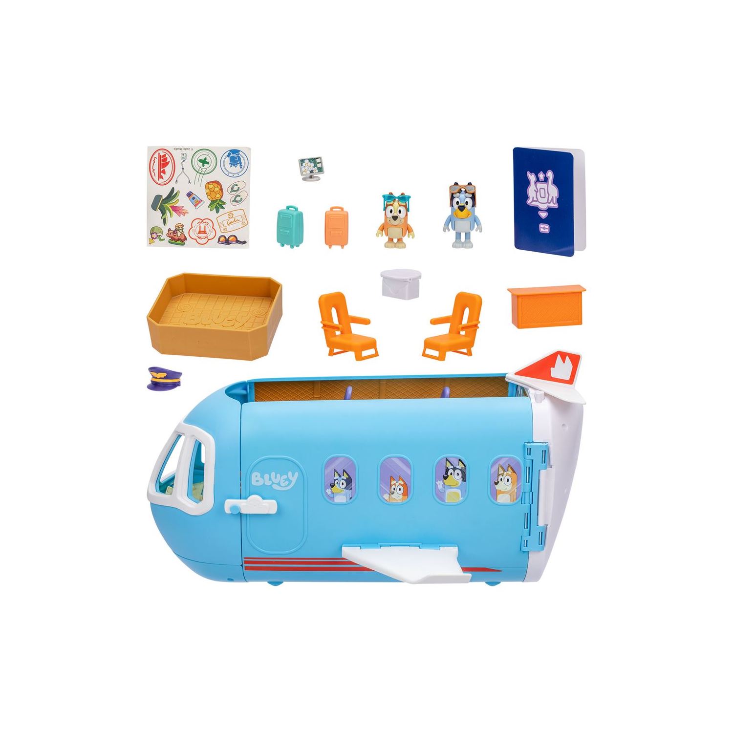 Bluey (pilot şapkası ve güneş gözlüğü ile) ve Bingo karakterleri setin içindedir — tatil macerasını canlandırın!