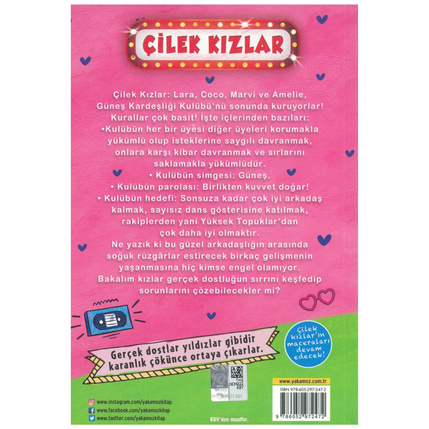 Çilek Kızlar: Lara, Coco, Marvi ve Amelie, Güneş Kardeşliği Kulübü’nü sonunda kuruyorlar! Kurallar çok basit! İşte içlerinden bazıları: • Kulübün her bir üyesi diğer üyeleri korumakla yükümlü olup isteklerine saygılı davranmak, onlara karşı kibar davranmak ve sırlarını saklamakla yükümlüdür. • Kulübün simgesi: Güneş. • Kulübün parolası: Birlikten kuvvet doğar! • Kulübün hedefi: Sonsuza kadar çok iyi arkadaş kalmak, sayısız dans gösterisine katılmak, rakiplerden yani Yüksek Topuklar’dan çok daha iyi olmaktır. Ne yazık ki bu güzel arkadaşlığın arasında soğuk rüzgârlar estirecek birkaç gelişmenin yaşanmasına hiç kimse engel olamıyor. Bakalım kızlar gerçek dostluğun sırrını keşfedip sorunlarını çözebilecekler mi? Gerçek dostlar yıldızlar gibidir karanlık çökünce ortaya çıkarlar.
