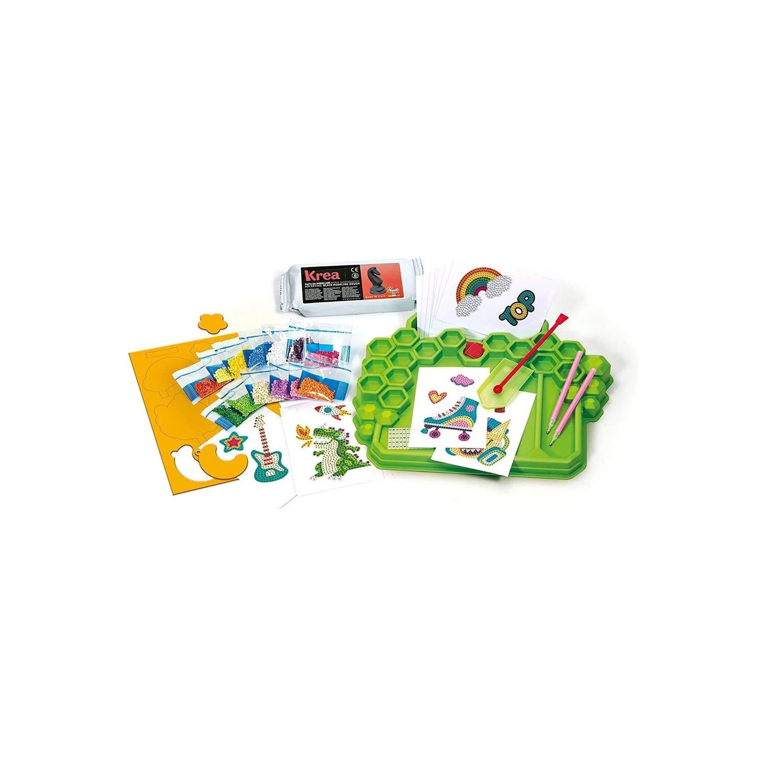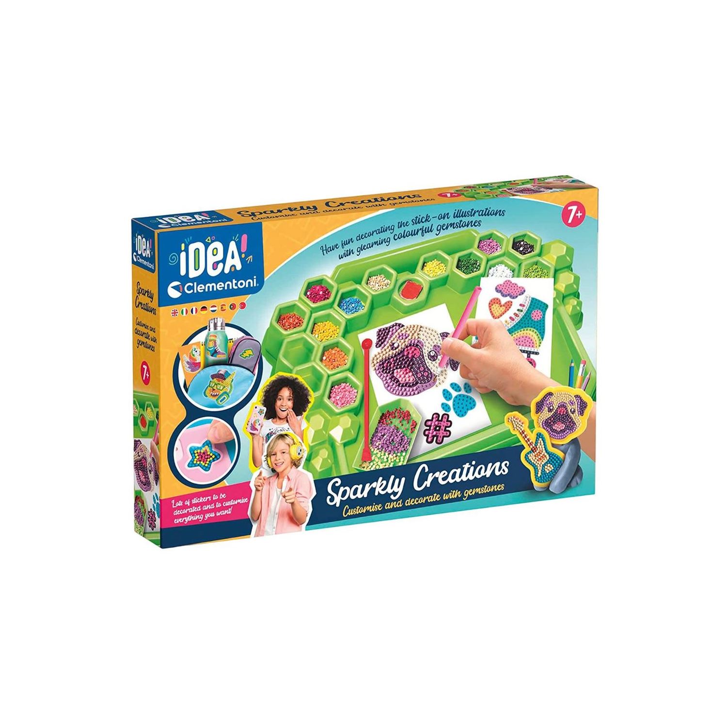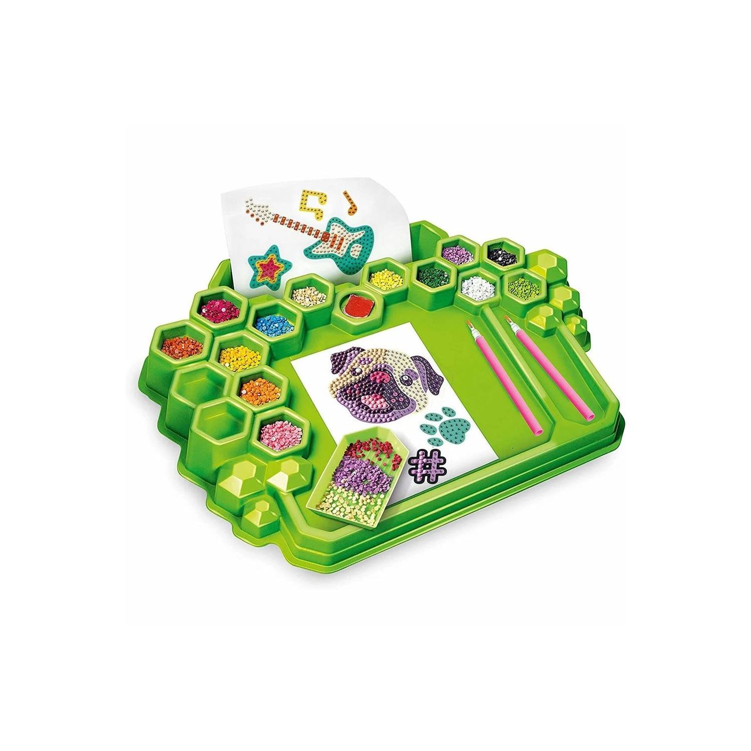 - Renkli ışıklarla süslenen suni elmaslarla değerli 3 boyutlu çıkartmalar oluşturacağınız bu oyunda, basit ve modern bir teknik ile son moda çıkartmalar yaratacak ve eşyalarınızı kişiselleştireceksiniz. - Odaklanma becerilerini geliştirmenizi, el beceriyle denemeler yapmanızı ve hem ellerinizi hem de beyninizi çalıştırmanızı sağlayacak modern ve yaratıcı bir aktivite! - Çalışma istasyonunuzu oluşturup alanınızı ayarlamak ve işe koyulmak için gereken her şey kutunun içinde! Kağıtlar, araçlar ve renklerine göre ayrılan suni elmaslar çalışma istasyonuna sığabiliyor.