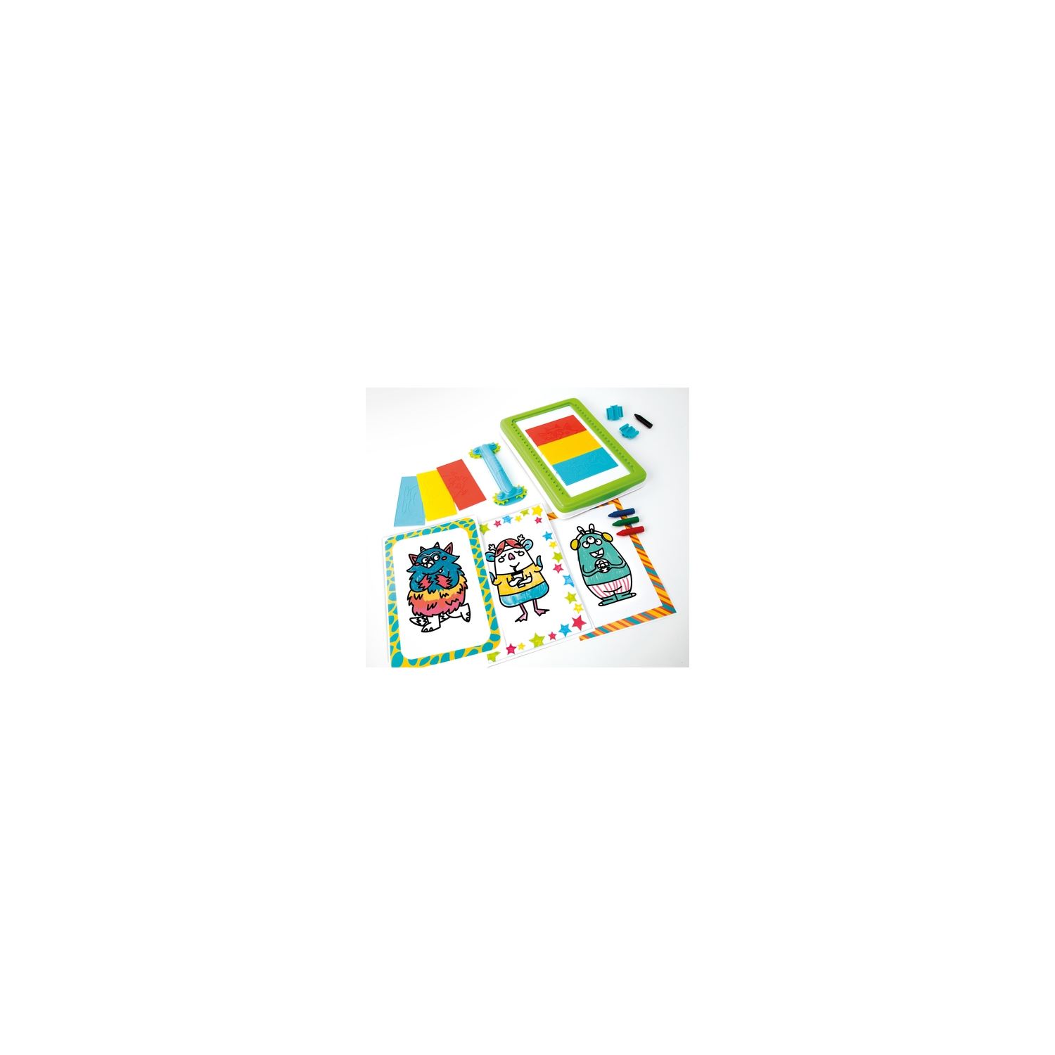 - Kartların üzerindeki resimler kabartmadır, böylece üstlerine bir kağıt yerleştirilmesi ve üzerlerinden imlece yerleştirilmiş mum boyayla geçilmesiyle desen sayfanın üzerine hemen çıkar!