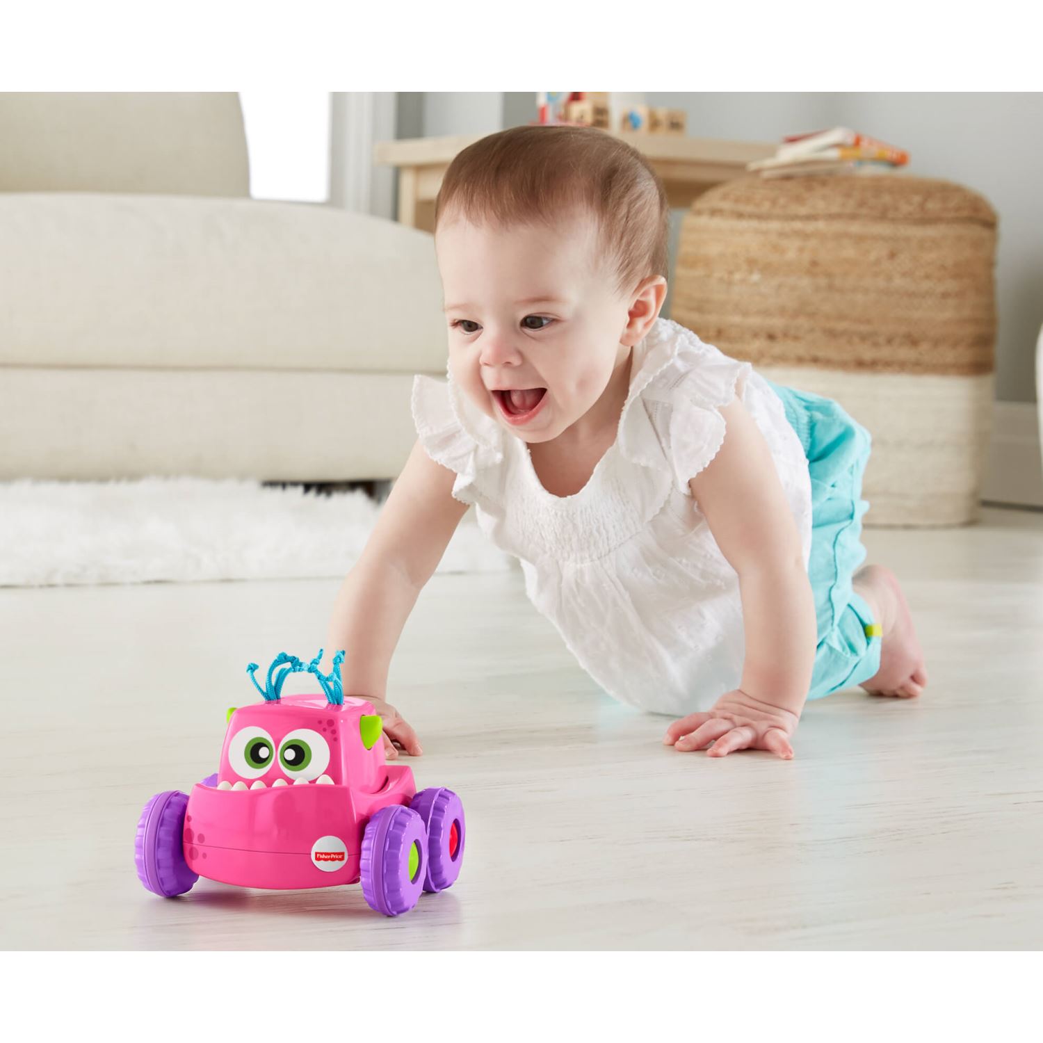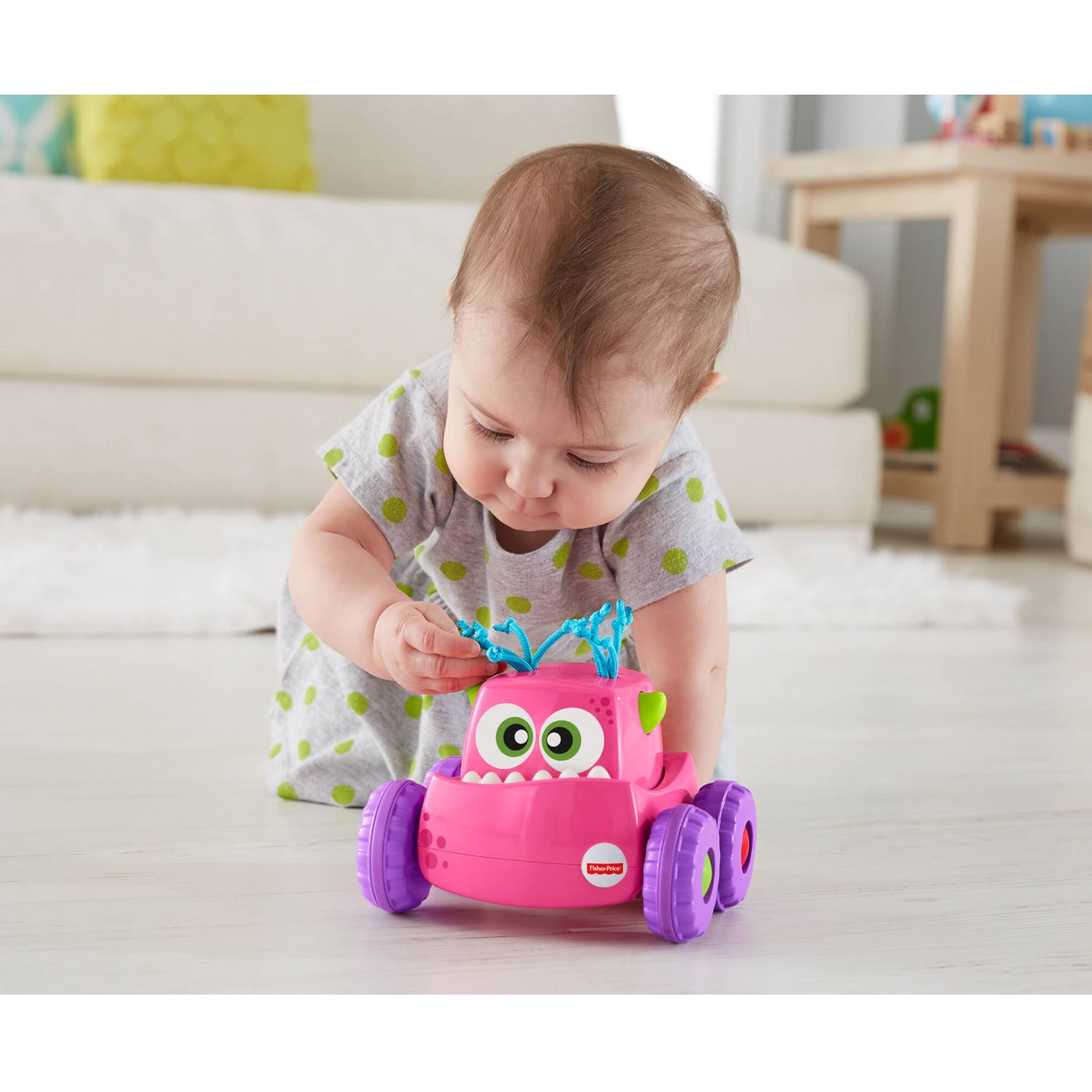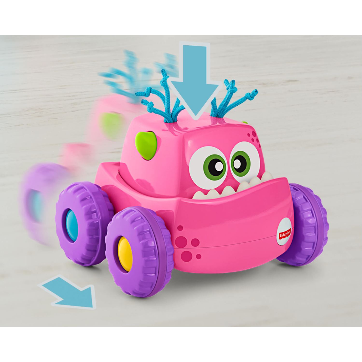 Hazır, başla! Fisher-Price® Sevimli Canavar Pembe Kamyonu ile hızlı bir oyuna başlama zamanı! Sevimli Canavarlar'ın kafasına basıldığında tekerlekleri dönerek ilerlemeye başlar. Böylece bebeğinizi peşinden emeklemeye teşvik eder. Ufaklığınız bu sevimli, renkli canavar arkadaşıyla sebep-sonuç ilişkisini keşfederken, kaba motor becerilerini geliştirir. Her biri ayrı ayrı ve stoklara bağlı olarak satılır. Gelişim ve oyun bir arada™ Kaba Motor Becerileri: Bebekler hareket eden Sevimli Canavarlar'ın peşinde yürürken veya emeklerken kaba motor becerilerini geliştirirler. Duyusal Beceriler: Yumuşak saç, diş ve boynuzlar gibi çeşitli dokularla bebeğin dokunma hissini tetikler. Zihinsel Gelişim: Bebekler, eylemlerinin fark yarattığını keşfediyorlar. Sebep ve sonuç ilişkisine harika bir başlangıç!