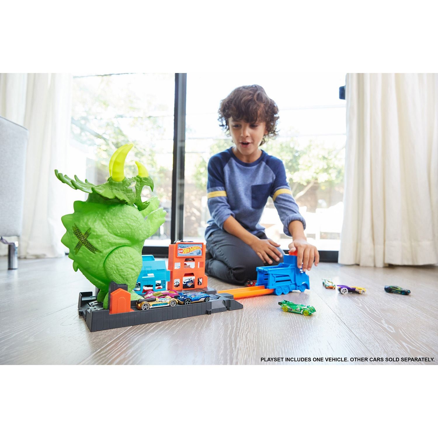 Çocuklar, oyunun hikayesini güçlendirmek ve beceriye dayalı oyunlar oynamak için devasa dinozora birden fazla metal arabayla meydan okuyarak becerilerini sınayabilir. |