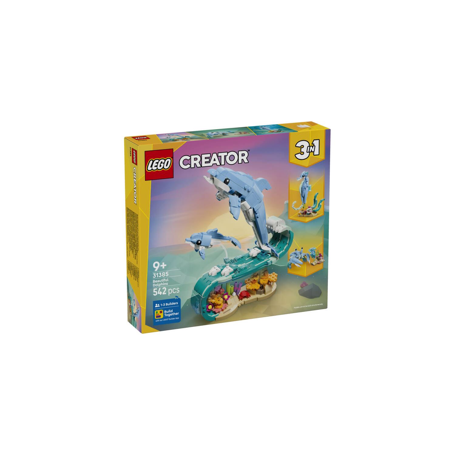 LEGO® Creator 3’ü 1 Arada Deniz Hayvanları: Güzel Yunuslar (31385) yapım seti, 9 yaş ve üzeri çocukların eğlenceli hikayeler oynamasını sağlar. Kız ve erkek çocuklara yönelik bu deniz hayvanı figürleri oyun seti, aynı yapım parçalarıyla 3 farklı model seçeneği sunar. Altında mercan olan dalgaya binmiş, duruşu ayarlanabilir bir yetişkin ve yavru yunusun dinamik bir modelini yapmayı seçebilirler. Bu daha sonra bu modeli, deniz yosunu ve duruşu ayarlanabilir istiridye içeren renkli bir stant üzerinde duruşu ayarlanabilir bir denizatına ya da deniz bitkileri ve denizanasının yanında bir yengece dönüştürülebilir. Oyun zamanı bittiğinde bu modellerden her biri rafta ya da masada güzel bir doğa dekoru olarak gururla sergilenebilir. Genç hayal güçlerine ilham verecek bu LEGO Creator 3’ü 1 arada set, deniz hayvanlarını seven çocuklar için harika bir hediye fikridir. LEGO Builder uygulamasını kullanarak her oyun setini güvenle yapabilir, kolay anlaşılır dijital talimatlarla yakınlaştırabilir, 3 boyutlu olarak döndürebilir ve ilerlemelerini takip edebilirler. Modellerin aynı anda yapılamayacağını hatırlatırız. Sette 542 parça bulunur.;