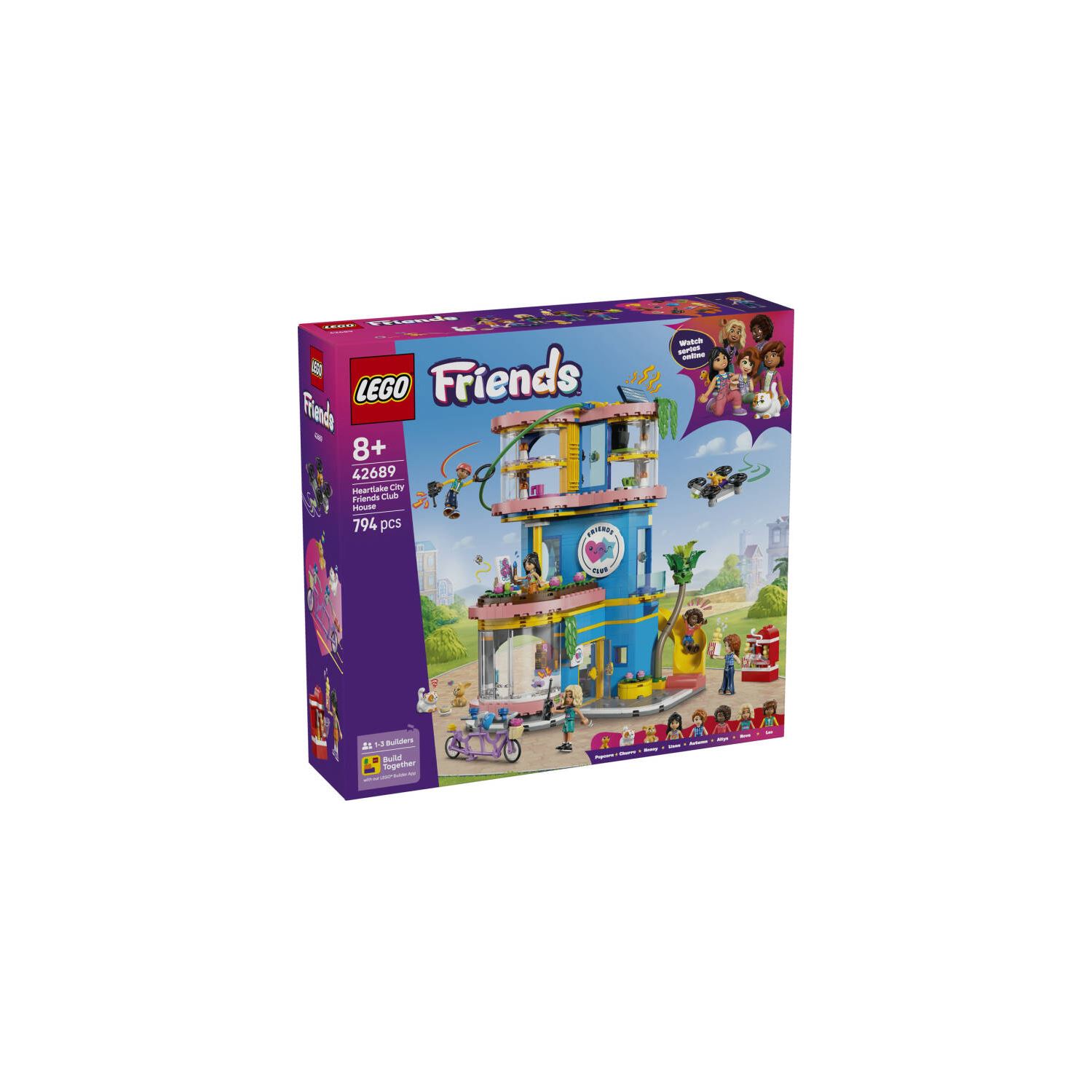8 yaş ve üzeri çocuklar LEGO® Friends Heartlake Şehri Friends Kulüp Evi (42689) oyuncak setini keşfederken hayal güçleri serbest kalsın. Kız ve erkek çocuklar, bu çocuk setiyle gizli görevler ve sonsuz hikayeler yaratabilir. Zipline, kaydırak ve tırmanma duvarında macera dolu anlar yaşayın. Gizli bilgisayarı ve drone'u kullanarak gizemi çözün. Evcil hayvanlara bakın, resim sehpası başında sanatla uğraşın veya mutfakta atıştırmalıklar hazırlayın. Çocuklar, tutkuları ne olursa olsun, burada bir şeyler keşfedebilir! Bu yapım seti, 5 mini bebek ile bir kedi, geko ve tavşan içerir. Çocukların hayal gücünü harekete geçirecek evcil hayvan kaseleri ve suyu, patlamış mısır makinesi, kumandaları olan oyun TV'si, buzdolabı, donutlar, çilekler ve waffle'lar gibi birçok aksesuar da bulunur. Çocuklara yönelik yapım seti, rol oyunu oyuncaklarını ve yaratıcı etkinlikleri seven kız ve erkek çocuklar için eğlenceli bir hediyedir. Herkesin kendi cihazlarını kullanarak setin bir kısmını inşa ederek eğlendiği LEGO Builder uygulamasındaki Birlikte İnşa Edin moduyla arkadaşlarınızla ve ailenizle birlikte eğlenin. Sette 794 parça bulunur.;