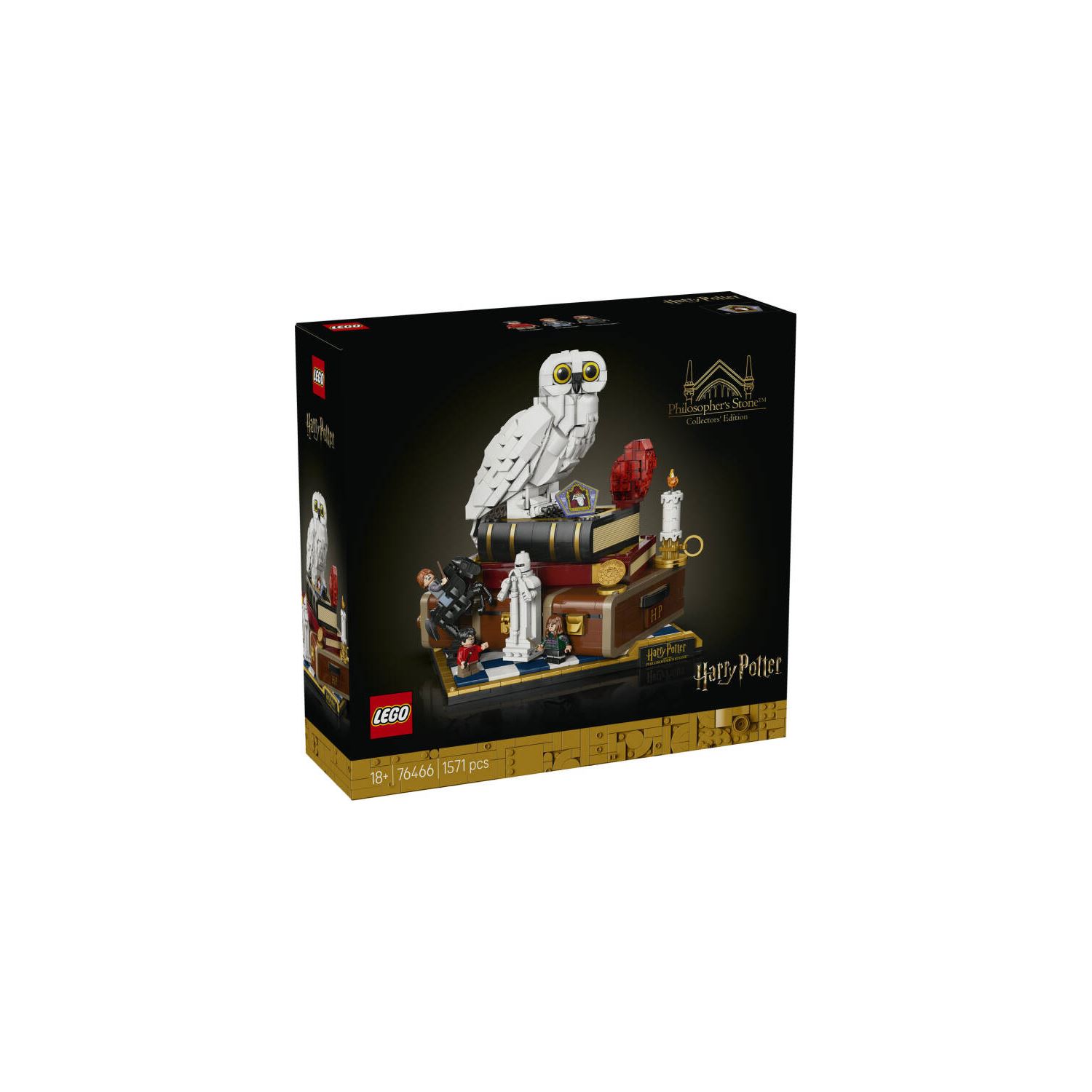 LEGO® Harry Potter™’ın 25. yıl dönümü Felsefe Taşı – Koleksiyoncu Versiyonu (76466) ile Harry Potter ve Felsefe Taşı nostaljisi yaşayın. Yetişkin Harry Potter hayranları için mükemmel bir yaratıcı hediye olan bu koleksiyonluk yapım seti; eğlenceli fonksiyonları, ikonik karakterleri ve nesneleri, ayrıca klasik sahnelerin mikro ölçekli versiyonlarıyla sihirli anılara ilham verir. Kanatları kapalı ilk LEGO Hedwig™ beyaz baykuş figürünü yapın ve Harry Potter’ın bavulunun üzerinde Felsefe Taşı’nın yanında sergileyin. Harry Potter™, Hermione Granger™ ve Ron Weasley™ olmak üzere 3 LEGO Harry Potter minifigürünü ve Çikolata Kurbağa kartı ve Büyücü Satrancı Tahtası gibi eşyaları ekleyin. 3 düğmeyi çevirerek Hedwig’in başını döndürün, Büyücü Satrancı Tahtası’nda Vezir’i hareket ettirin ve Harry Potter’ın bavulunun yan tarafını havaya uçurarak dağ trolünün tuvaletteki saldırı sahnesini ortaya çıkarın. Diğer mikro ölçekli sahneler, Hogwarts™ Ekspresi’ni ve Harry’nin Felsefe Taşı’nda yaşadığı 5 zorluğu betimler. Sette 1571 parça bulunur.;