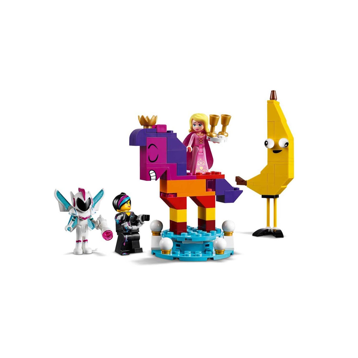 Bu eğlence dolu yapım oyuncağında dönen platform üzerinde at biçiminde Kraliçe Watevra Wa’Nabi, ayrıca şekil değiştiren kraliçeyi yapım parçası yığını şeklinde yeniden yaptığında kullanmak için 4 farklı yüz ifadesi baskısı bulunur. Bu LEGO FİLMİ 2 setine ayrıca parçalarla yapılan Banarnar karakteri, Tatlı Kargaşa ve Susan mini bebekleri ile bir Lucy minifigürü dahildir